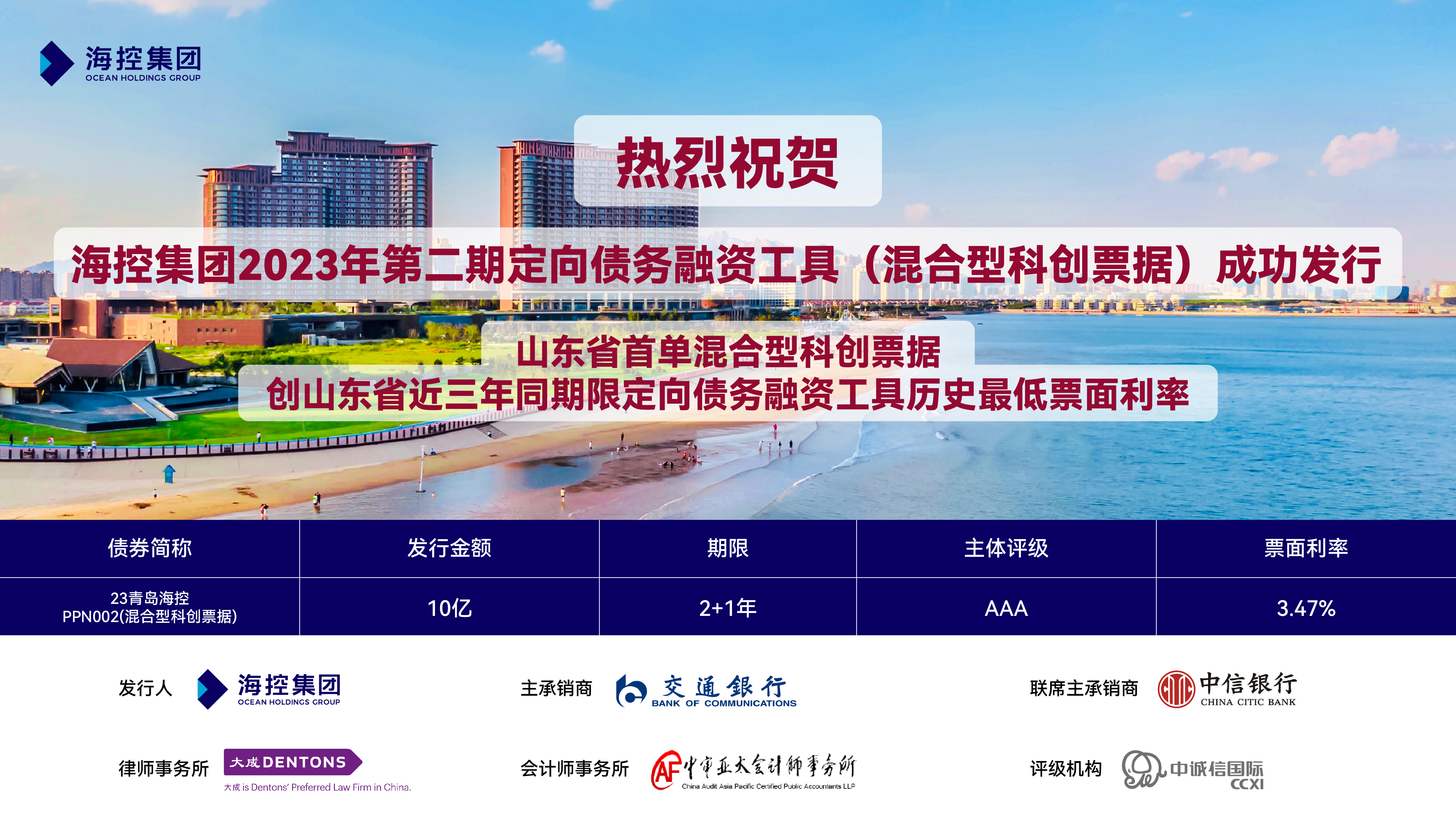 近日,??丶瘓F“2023年度第二期定向債務融資工具(混合型科創票據)”成功發行,為山東省首單混合型科創票據,發行金額10億元,期限為2+1年,票面利率3.47%,創山東省近三年同期限定向債務融資工具歷史最低票面利率。